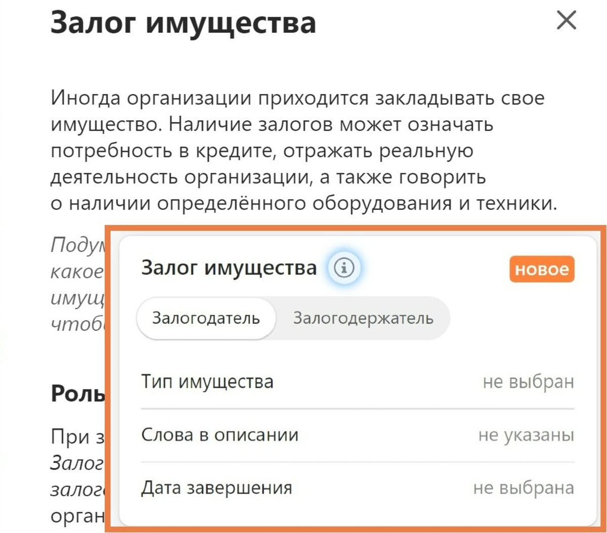 Кнопка 🛈 рядом с названием тематического блока нужна, если пользователь забыл, как пользоваться фильтрами залогов — нажмите на нее, чтобы посмотреть подсказки.