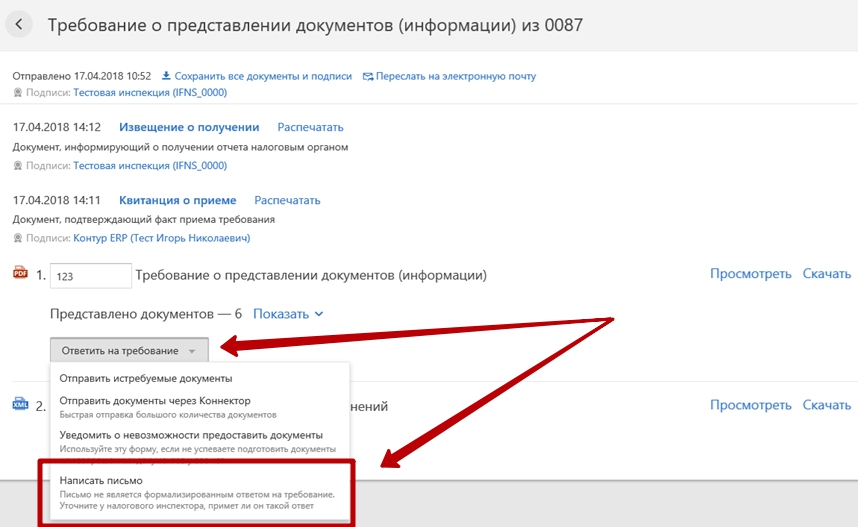 В Экстерне можно отправить письмо с ответом на требование непосредственно из раздела «Требование». Для этого воспользуйтесь кнопкой «Ответить на требование», а затем выберите в списке — «Написать письмо».